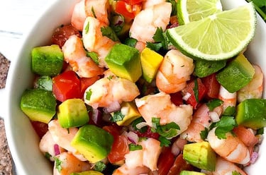 Salada oriental com recheio de camarão cortado aos cubos, abacate ou manga, delícias do mar, arroz shari com molho do Chief.