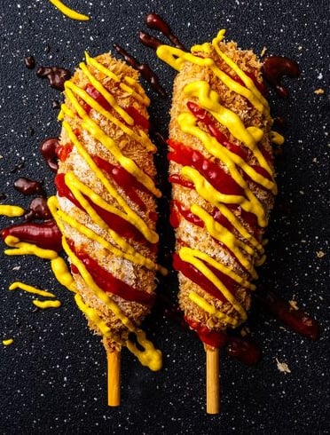 Cachoro quente coreano, recheado com salsinha, frango, queijo, fritos no panko.