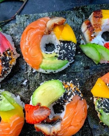 Sushi em formato de Donuts recheado com abacate, salmão, atum, manga e camarão.